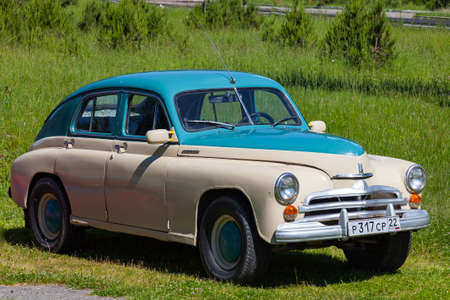 Altai, Russia - 05.09.2019: Front view of the double colored green and beige old Russian car released in the Soviet Union Black GAZ m20 pobeda victory that used in second world war