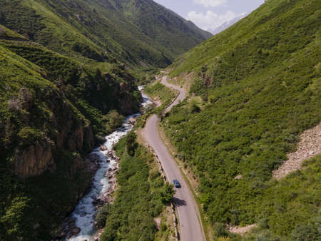 SUV UAZ on the road against the background of mountains. Summer day, clear blue sky