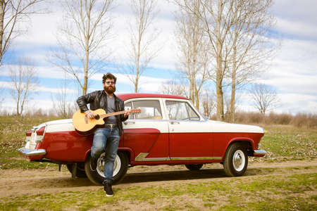 A young man sits on the seat of a vintage car with the door open, a freshly cut down Christmas tree on the roof of a vintage car. Lifestyle, holiday. Christmas.