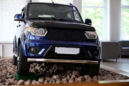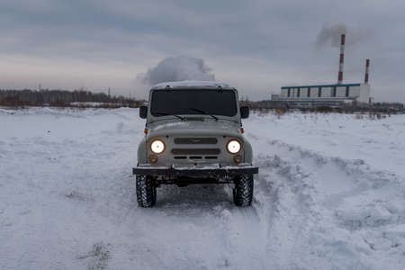 Russia, Novosibirsk-January 20, 2020 Russian 4x4 four-wheel drive SUV UAZ hunter stands in the winter in the snow in the semi-darkness with the lights on and a tinted windshield.