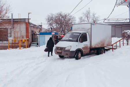 VOLGOGRAD, RUSSIA - 22 December, 2018: The parking of cars near buildings in winter season when lies snow, Volgograd