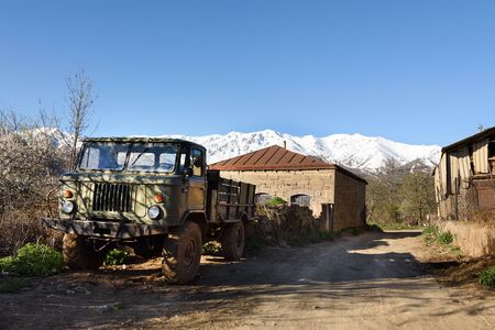 An old truck on a rural road. A battered truck is parked on an old paved road in a high-altitude area on a Sunny day.