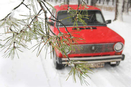 Chernihiv, Ukraine - January 20, 2020: Old red VAZ 21011 car in the winter forest. Foreground branches