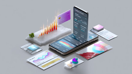 An illustrative representation of modern financial analytics featuring a smartphone with various data visualizations and growth metrics, emphasizing technology in business.