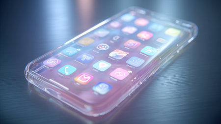A person is engaging with a smartphone while a variety of social media app interfaces surround them on a sleek workspace.