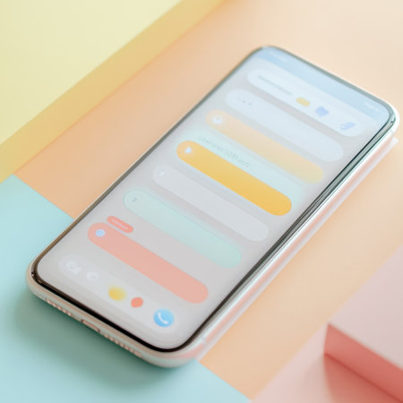 Brightly lit smartphone rests on a pastel colored surface displaying vibrant messenger chat messages with clear text bubbles.