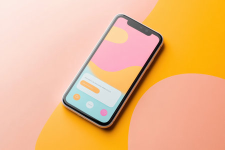 Smartphone rests on a colorful surface showing an engaging messenger chat interface with bright colors and notifications.