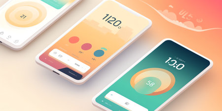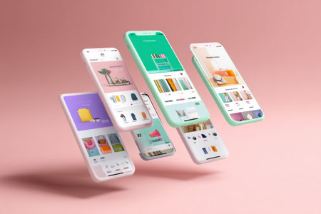 Pastel colored ecommerce app interface screens are suspended in mid-air, displaying categories such as clothing and home decor in a visually appealing layout.