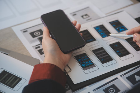 Close up ux developer and ui designer brainstorming about mobile app interface wireframe design on table with customer breif and color code at modern office.Creative digital development agency