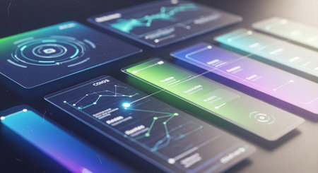 This image showcases a futuristic digital dashboard featuring various data visualizations and analytics insights ideal for business performance monitoring.