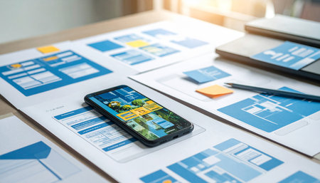 An organized workspace featuring sketches, digital devices, and creative tools used in mobile app design. The scene showcases the design process, highlighting brainstorming and planning with effective visual aids.