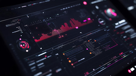 Explore a high-tech user interface featuring a digital dashboard with various metrics and analytics. Perfect for technology themes and futuristic concepts.