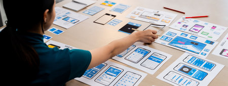 Top view of software developer working on Ux Ui design while team working together to brainstorm and develop wireframe prototype designing at creative digital company. Teamwork concept. Convocation.