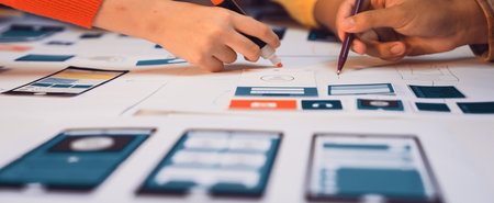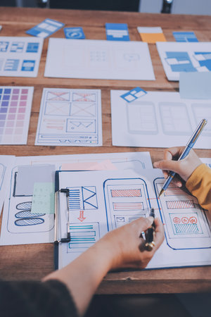 Close up ux developer and ui designer brainstorming about mobile app interface wireframe design on table with customer breif and color code at modern office.Creative digital development agency