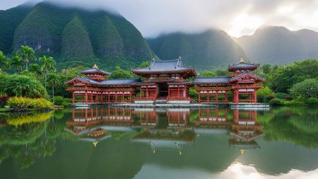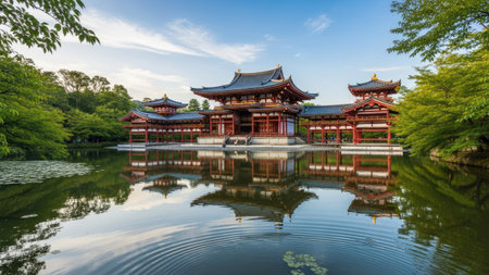 A traditional Japanese temple with distinctive red and green architecture is reflected in calm water. A small bridge connects to the temple, surrounded by trees. The scene is bathed in natural light, suggesting an outdoor environment ideal for travel and cultural themes. Suitable for various editorial and commercial applications.