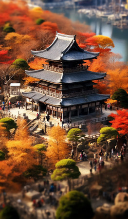 An AI-generated illustration of a beautiful Japanese temple with a lush garden in autumn