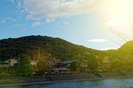 Arashiyama forest view in the Autumn along Katsura river. Kyoto, Japan.