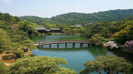 This image captures a tranquil Japanese garden featuring a peaceful lake with a wooden bridge, surrounded by lush greenery and traditional architecture, creating a serene atmosphere.