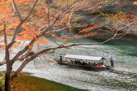 KYOTO,JAPAN - NOVEMBER 25, 2019: Boatman punting the boat for tourists to enjoy the autumn view with maple trees along the bank of Katsura river in Arashiyama, Kyoto, Japan.Arashiyama is one of tourist destination in Kyoto.