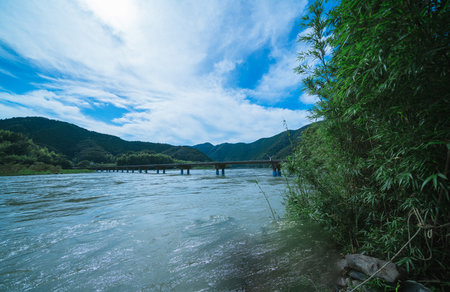 Landscape view of the river and the mountains under the blue sky at Shimanto river