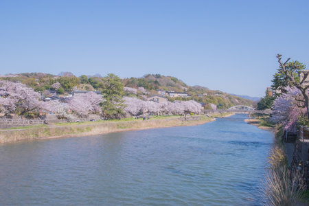 Takano river with cherry blossoms at spring in Kyoto, Japan
