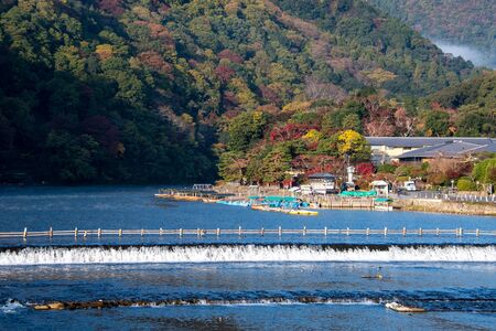 colorful leaves mountains and Katsura river in Arashiyama, landscape landmark and popular for tourists attractions in Kyoto, Japan. Fall Autumn season, Vacation,holiday and Sightseeing concept