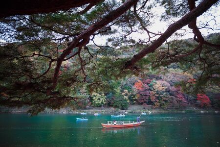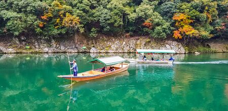 ARASHIYAMA, JAPAN - NOVEMBER 23, 2017: Unidentified people on tourist boat to signtseeing Arashiyama with autumn foliage colors.