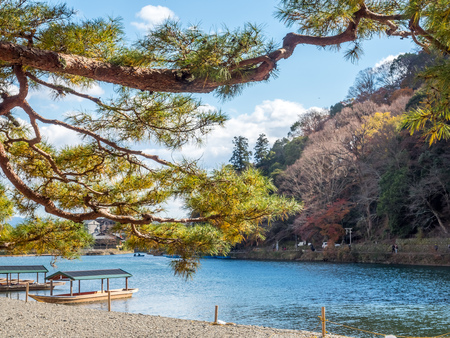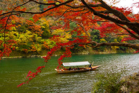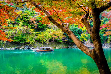 Beautiful Arashiyama river with maple leaf tree and boat around lake in Autumn season Kyoto Japan