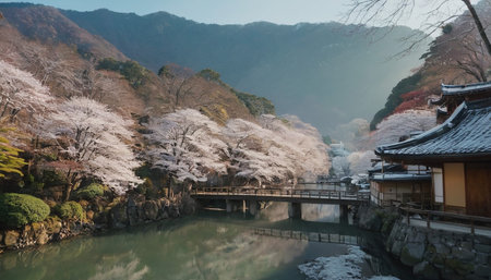 A picturesque Japanese village featuring snow-dusted traditional buildings and blooming cherry blossoms alongside a calm river with a bridge.