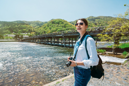 elegant girl traveler standing next to the clean river and see the beautiful view. elegant woman enjoy the beauty of the blue sky in kyoto trip in Japan. backpacker travel lifestyle.