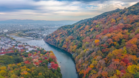 Top aerial view of the mountain river with the town city in scenery view of autumn, Arashiyama in Kyoto city of Japan in autumn season change on mountain along the river, popular and famous place for tourist visit Japan