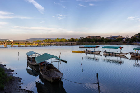 Scenic landscape from Arashiyama with japanese boats at the dock on Katsura river, in Kyoto.
