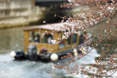 Cherry blossom on river bank in Kyoto, Japan. Cherry blossom festivals are one of the most colorful events of the year in Japan.