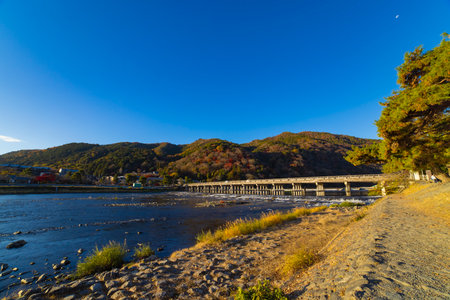 Togetsukyo bridge near Katsuragawa river in Kyoto in autumn wide shot