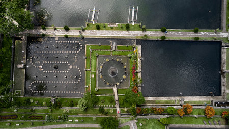 Aerial view of Taman Ujung water palace near Alampura in Karangasem on Bali Island. Ancient palace of Balinese royal family with water pools and tropical landscape park. Indonesian art and culture.