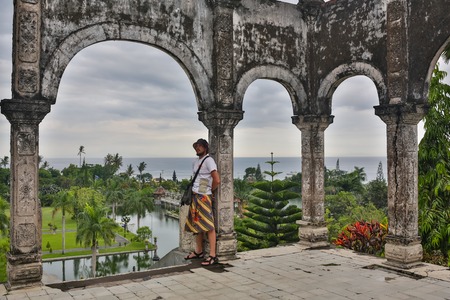 Young beautiful woman in Taman Ujung water palace, Bali island, Indonesia