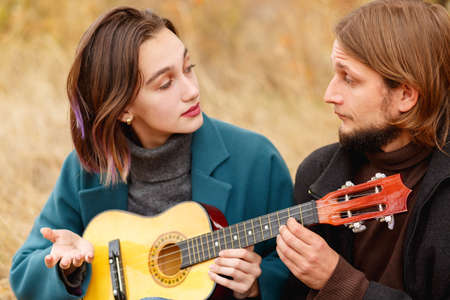 young caucasian man in casual wear sit playing ukulele with woman. Concept of people love,relationship, instruments and music