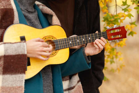 The guy looks like a girl playing on a ukulele in the autumn forest close-up