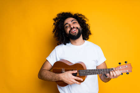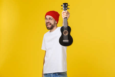 Attractive young man in summer clothes playing ukulele and singing isolated over yellow background