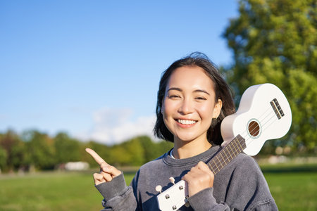 Portrait of asian smiling girl, holding ukulele over shoulder, pointing finger at copy space, banner or logo