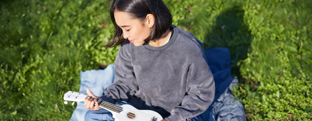 Vertical shot of girl musician, looking with care at her white ukulele guitar, playing music in park, sitting on grass