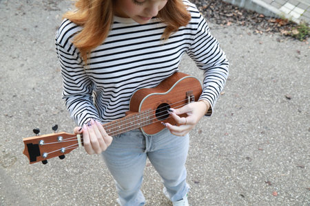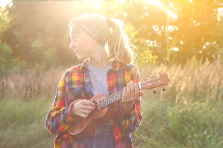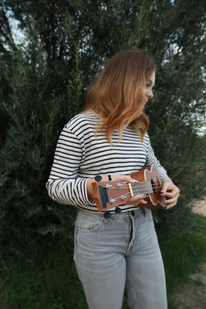 Girl Practices With Ukulele Musical Instrument In The Countryside During A Break
