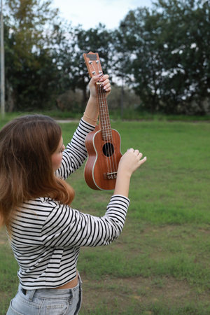 Young caucasian woman playing ukelele in the park