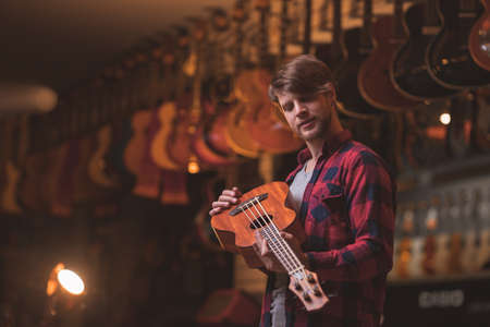 Young disabled man with artificial prosthetic hand plays on Ukulele guitar at shop