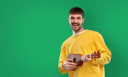 happy man playing ukulele guitar over green