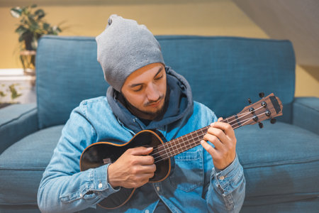 Musician in a denim jacket and hoodie sits comfortably on a blue sofa, playing a black ukulele. Boy with talent is playing the ukulele in the safe environment of his home. Focus on music.