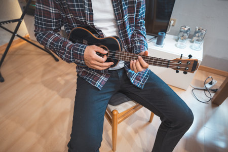 Man strums a black ukulele while seated indoors, focusing intently on his music. The plaid shirt and natural wood tones around him add warmth to the creative atmosphere.