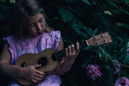 Beautiful young girl with blond hair wearing pink dress playing ukulele. Blooming peonies on dark nature background. Cutie lady learns play guitar concept