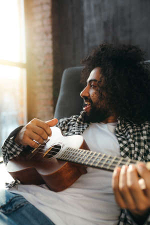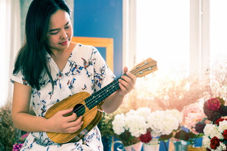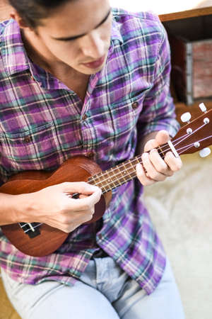 Closeup handsome man was playing a Ukulele enjoyed in the room