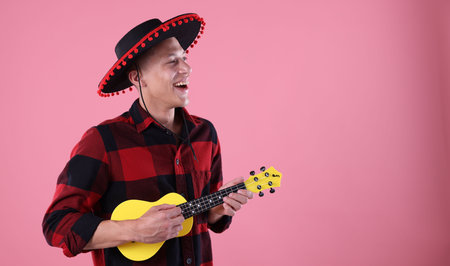 Smiling man in black Flamenco hat playing ukulele on pink background. Space for text